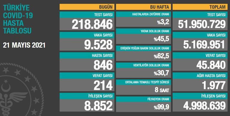 Sağlık Bakanlığı, 21 Mayıs corona virüs tablosunu paylaştı. Son 24 saatte 218 bin 846 Kovid-19 testi yapıldı, 9 bin 528 kişinin testi pozitif çıktı, 214 kişi hayatını kaybetti. Ağır hasta sayısı 1 bin 977 oldu, 8 bin 852 kişinin Kovid-19 tedavisinin/karantinasının sona ermesiyle iyileşen sayısı 4 milyon 998 bin 639'a yükseldi.